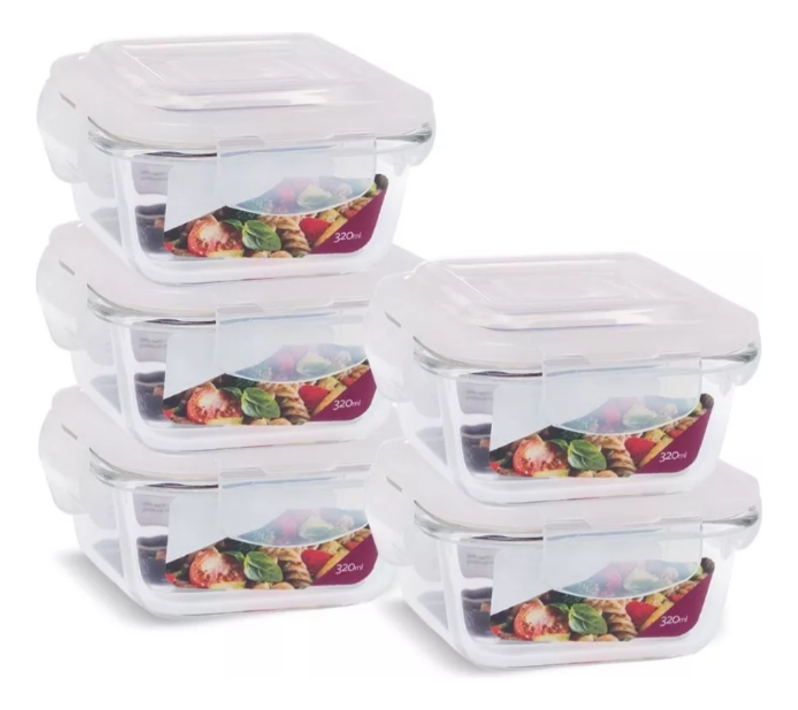 Kit 5 Potes Vidro Hermético Trava Quadrado 320ml Marmita
